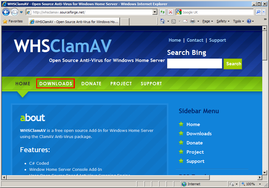 First go to http://whsclamav.sourceforge.net/ and click on Downloads: