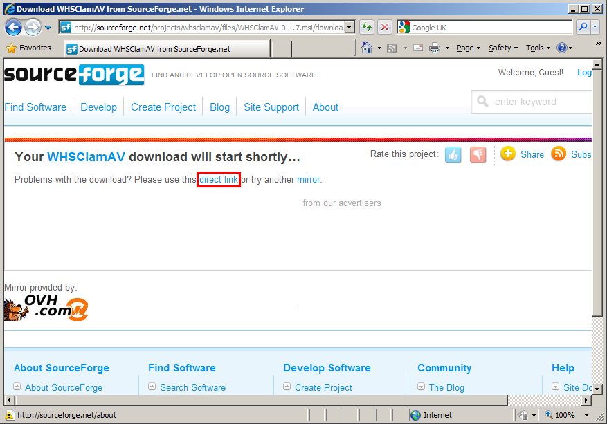 his will take you to the sourceforge website where you can download the MSI (the installer) that you will be saving on your Windows Home Server Software Share. Depending on your setup you may need to click on the "direct link" link to start the download process: