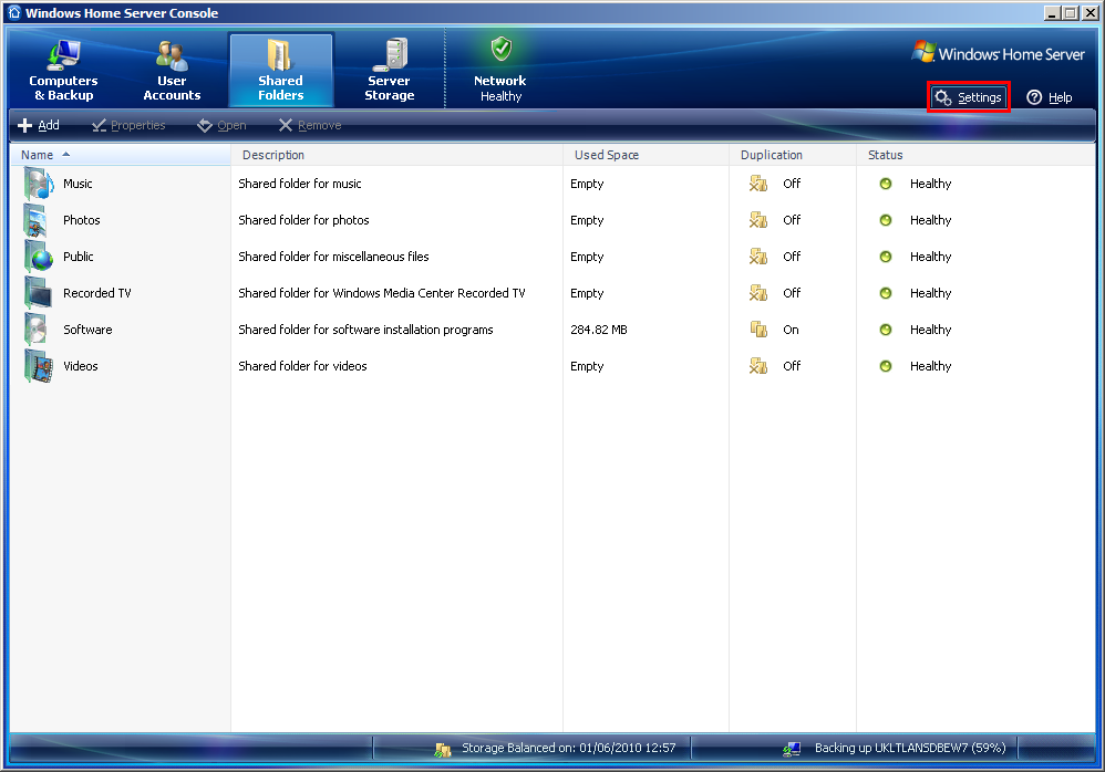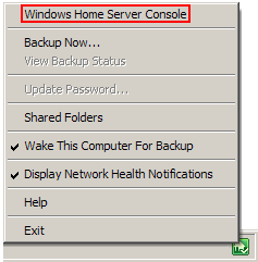 ow open the Windows Home Server Console from a client machine that is connected to the server (you will find the connector icon in the system tray - right click on it and select "Windows Home Server Console" from the pop up menu):