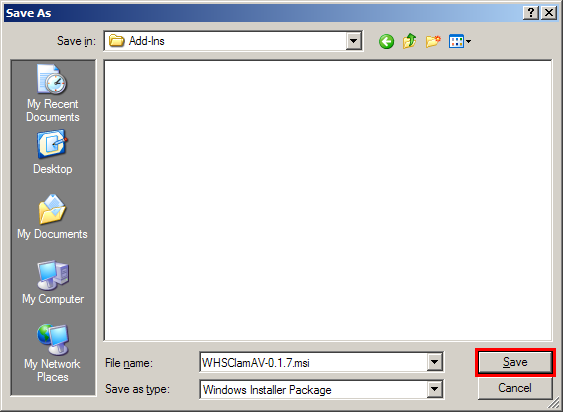 elect Save and ensure you select the Add-Ins folder within the Software Share of your Windows Home Server - i.e. \\server\Software\Add-Ins where Server is the name of your Windows Home Server: