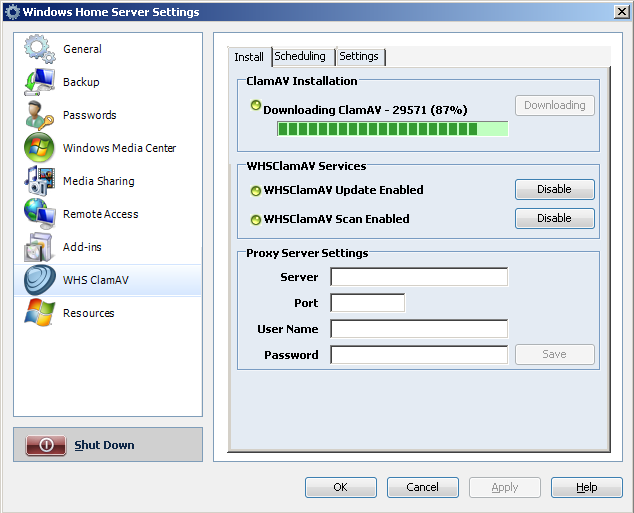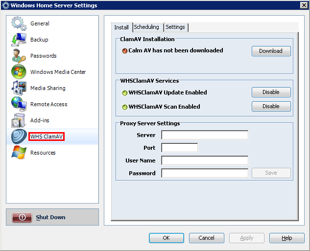 f you are behind a proxy server (in nearly all cases this will not apply if you are a home user) then fill out the proxy details. Then Click on the "Download" button - this will start the process of downloading ClamWin from the sourceforge website. Remember that WHSClamAV is an Add-In for Windows Home Server that allows you to use ClamWin from within Windows Home Server. The writer of WHSClamAV does not produce ClamWin or its upstream code of ClamAV.