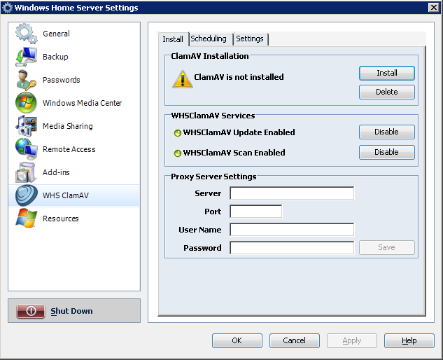 e-open the Windows Home Server Console once it has closed and navigate back to the Windows Home Server Settings Window - this time select the "WHS ClamAV" tab: